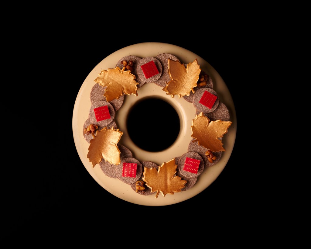Un gâteau recouvert d’une fine coque au chocolat au lait du Pérou qui recouvre une mousse onctueuse au chocolat au lait, praliné amande et sobacha, crème vanille torréfiée et le confit d’agrumes.