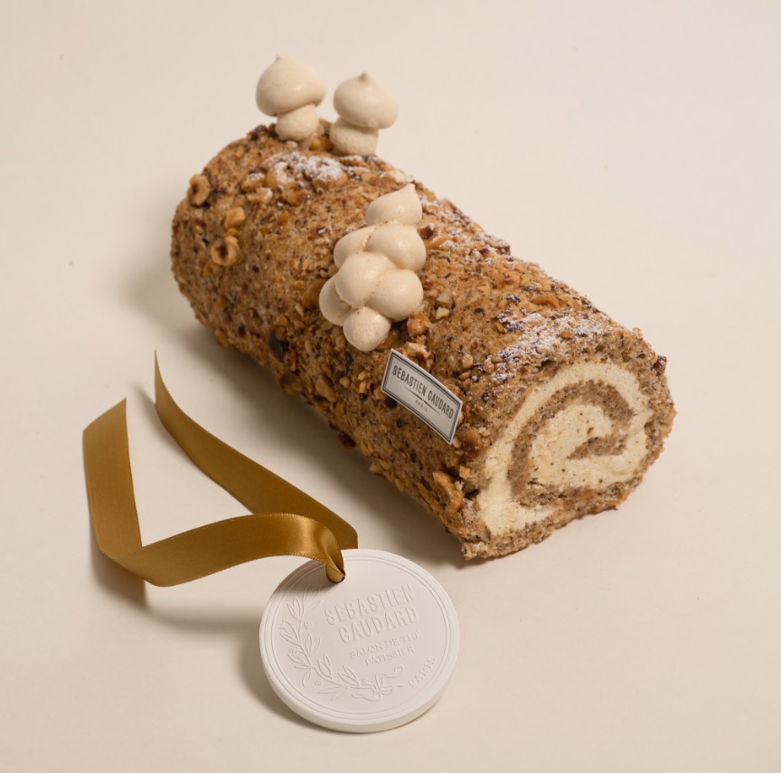Biscuit roulé macaron noisette délicatement imbibé d’eau de fleur d’oranger, crème à la vanille Madagascar.