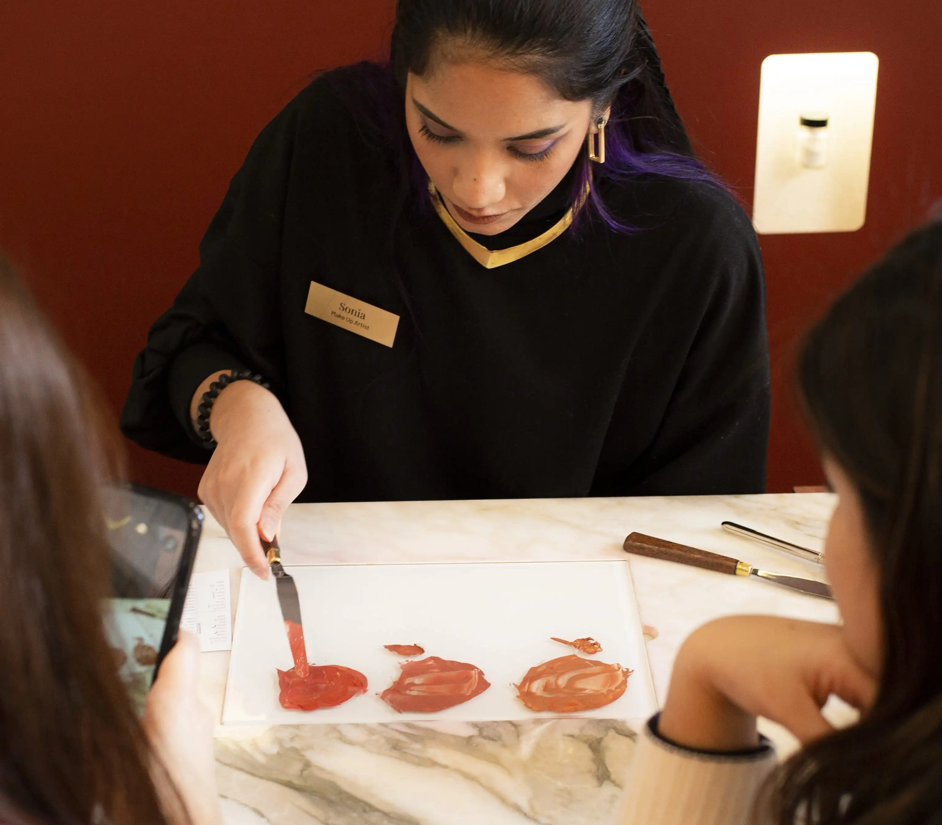Pendant 30 minutes, le client est accompagné par un maquilleur professionnel tout au long de son parcours. Il y a tout d’abord un échange pour avoir une idée de la couleur souhaitée (est-ce que le client a une idée en tête, est-ce qu’il veut reproduit un ancien favori…) puis le make up artist va travailler les pigments comme un peintre pour obtenir un premier jet.